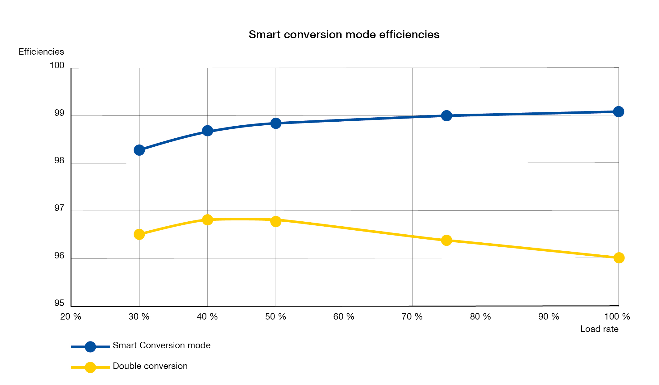 Ker kot glavni vir napajanja uporablja statično linijo by-passa, način pametne pretvorbe energije dosega najvišje ravni učinkovitosti, ki so na voljo na tržišču. V nasprotju z dvojno pretvorbo energije, kjer je pri visokih ravneh obremenitve mogoč padec učinkovitosti, statični by-pass poveča učinkovitost, ko je obremenitev visoka, in znatno poveča proizvedeno električno moč. Pri visoki stopnji obremenitve v načinu pametne pretvorbe energije se stopnja PUE podatkovnega centra znatno izboljša.